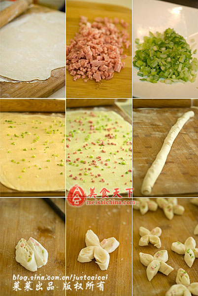 中筋粉300g、水140g、盐一勺、糖20克、酵母4克、香油2勺、盐若干、香葱、火腿片2片。