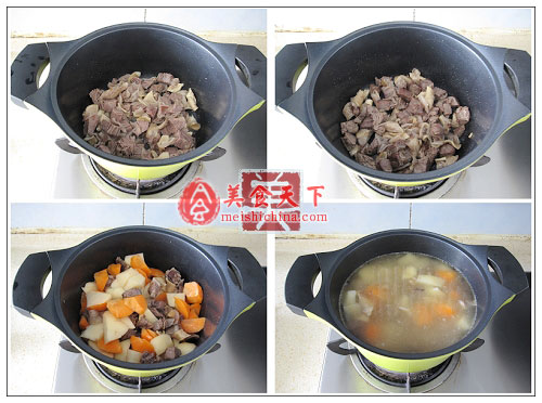 4、加入土豆和胡萝卜块,翻炒均匀;