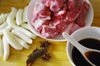 排骨400G、年糕200G、大料2个、桂皮1片、冰糖1汤匙、花雕酒1汤匙、酱油2汤匙、盐少许、大葱段、蒜片、以及香葱适量。