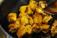 3、此时放入排骨,将排骨均匀地裹上刚刚炒好的糖色。