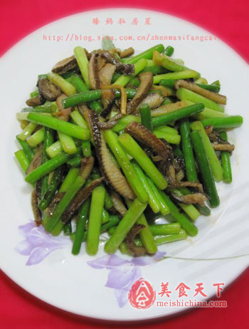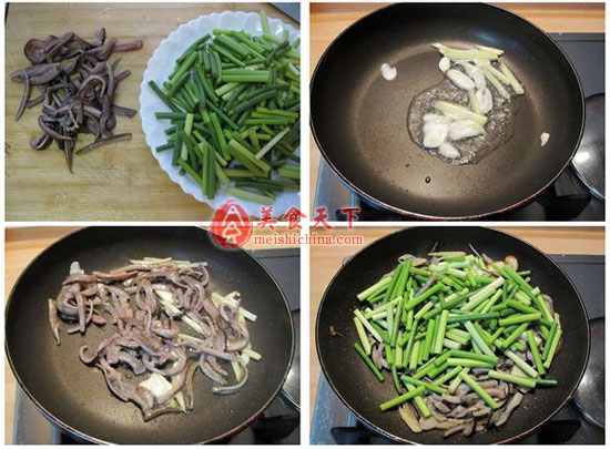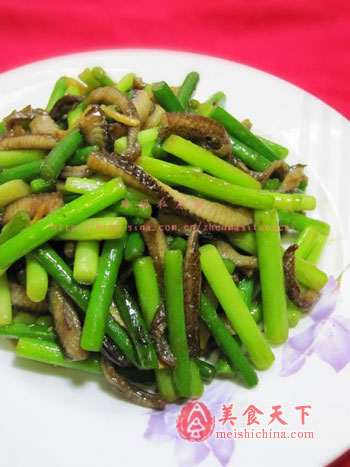 4、鳝丝炒至5成熟时放入蒜苔一同翻炒,调入少许盐,美极鲜酱油,少许糖,翻炒成熟即可。