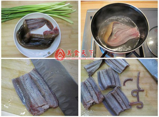 2、锅中水烧沸,放入洗干净的黄鳝略烫,可去除表面的粘液;黄鳝洗净后切段,将鳝骨用刀剔除后切丝。
