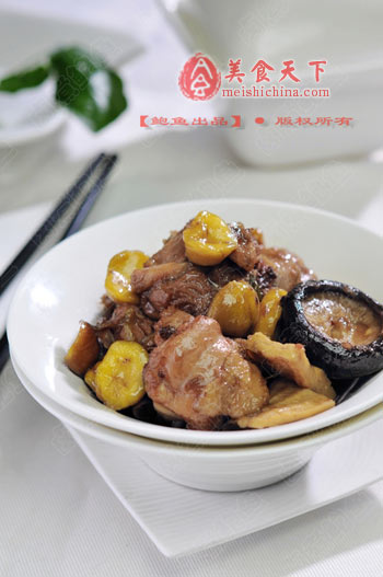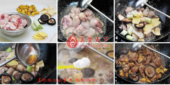1、鸡腿肉洗净斩块,笋干清水泡软切块,生栗子去皮,葱姜水发香菇备用。