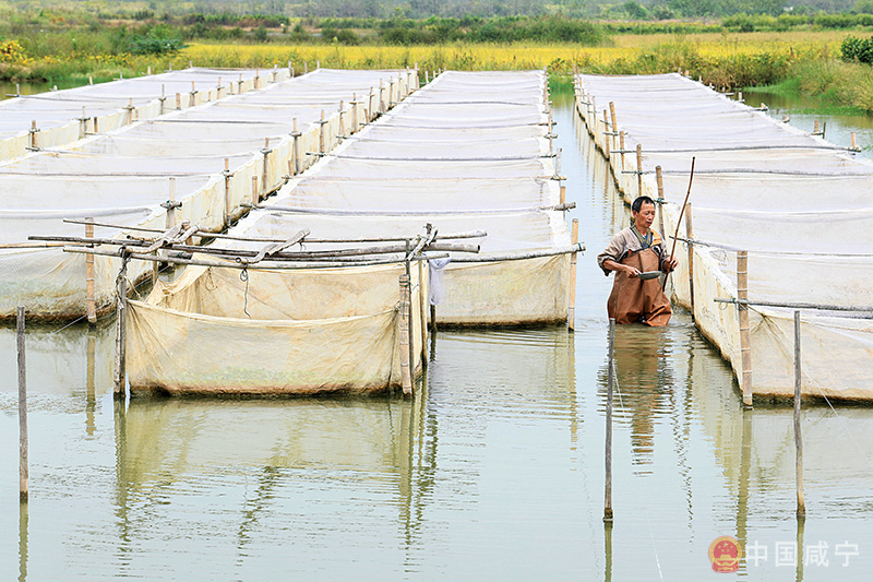 日前,赤壁市神山镇毕畈村11组,水蛭养殖户谢守平在喂食网箱内的水蛭。该村今年通过积极调水,确保了水稻和水产养殖收成。