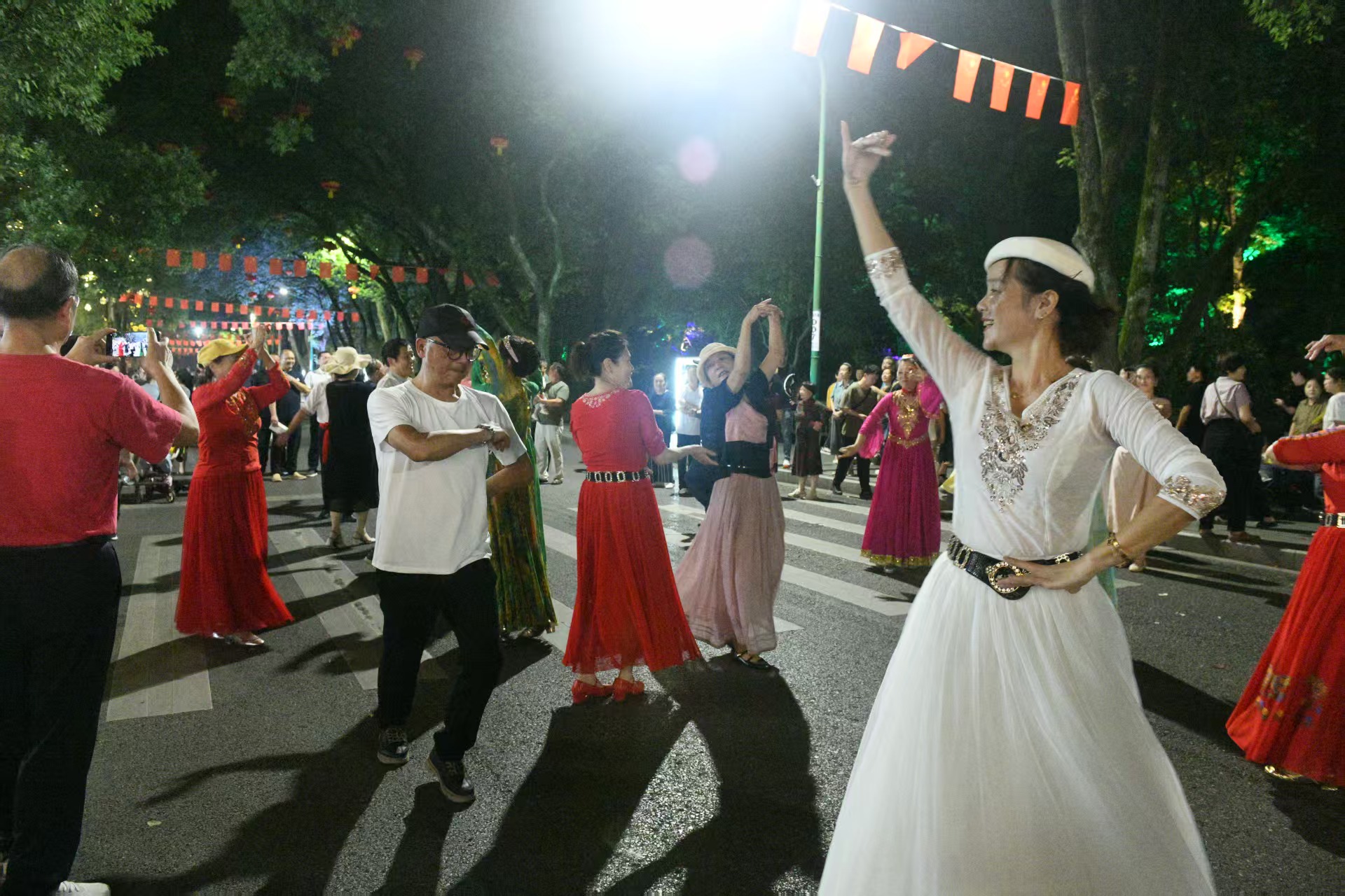 夜晚,月亮湾街区化身“诗意舞台”。“桂香缘你·悦见咸宁”音乐节持续开唱,Line2乐队、房俊喆等艺人轮番登场,经典老歌与青春潮音交替回荡。当《我和我的祖国》旋律响起,万名观众手举红旗同唱,将节日氛围推向高潮。同步举办的“创意香城幸福咸宁”咸宁优品·非遗文创市集上,剪纸、拓印版画与“大畈麻饼”“麦市香干”等特色美食相映成趣,吸引市民游客驻足。