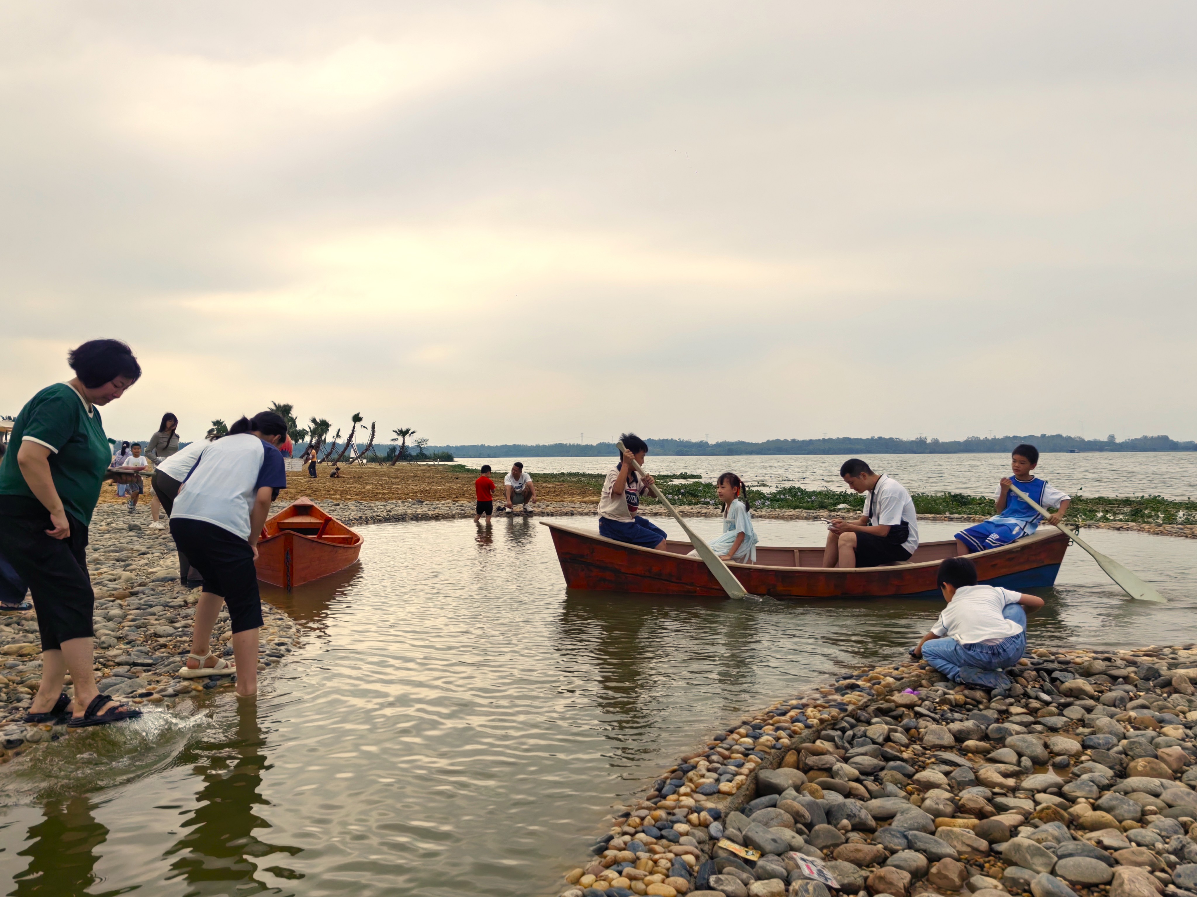 金沙滩处,摇曳的棕榈树、金黄色的细沙、飞溅的浪花构成了一幅绝美的图景。游客们或是赤足漫步在沙滩上,或是在悠闲地躺在沙滩椅中,或是在水渠边摸石嬉水……惬意的湖滨风光一览无遗。