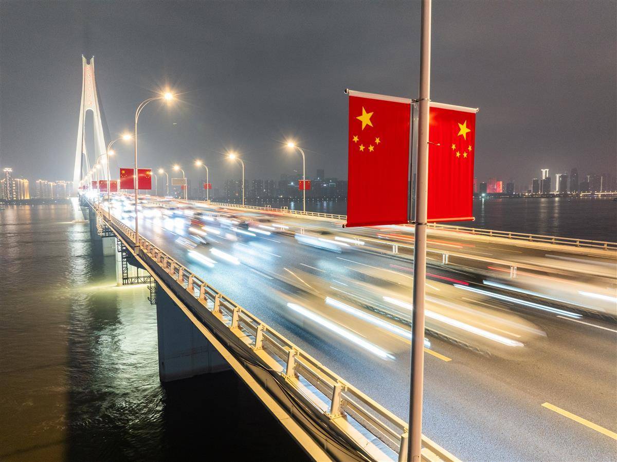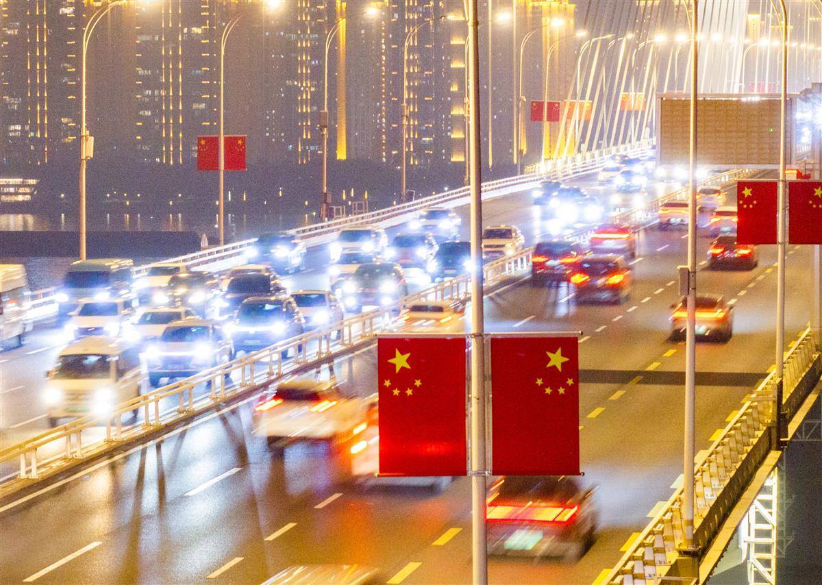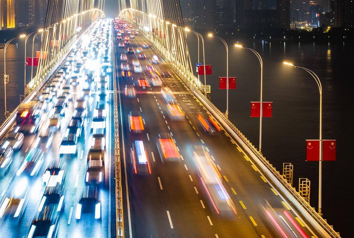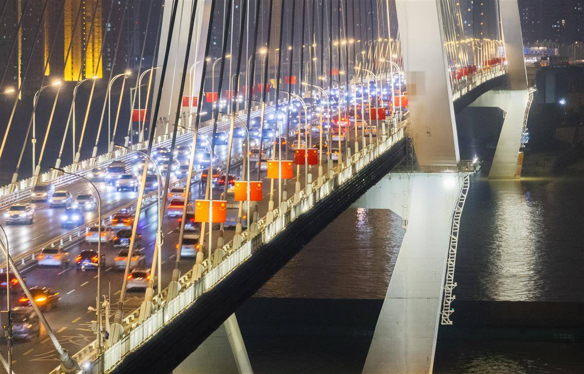 9月30日晚,节前晚高峰,武汉二七长江大桥上车水马龙。大桥两边悬挂的五星红旗迎风飘扬,让每一颗踏上归途的心,都在这份庄严而温暖的氛围中找到了节日的归属感。(湖北日报全媒记者 柯皓 摄)