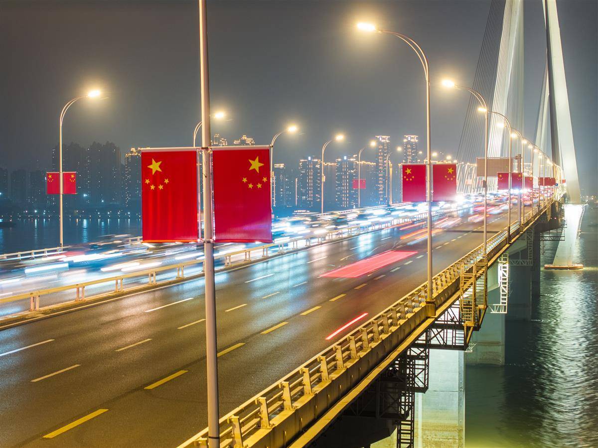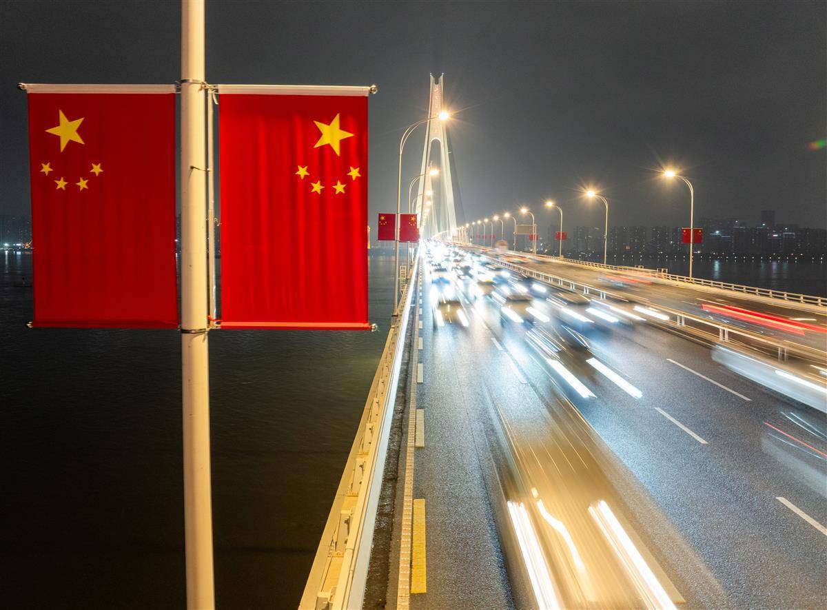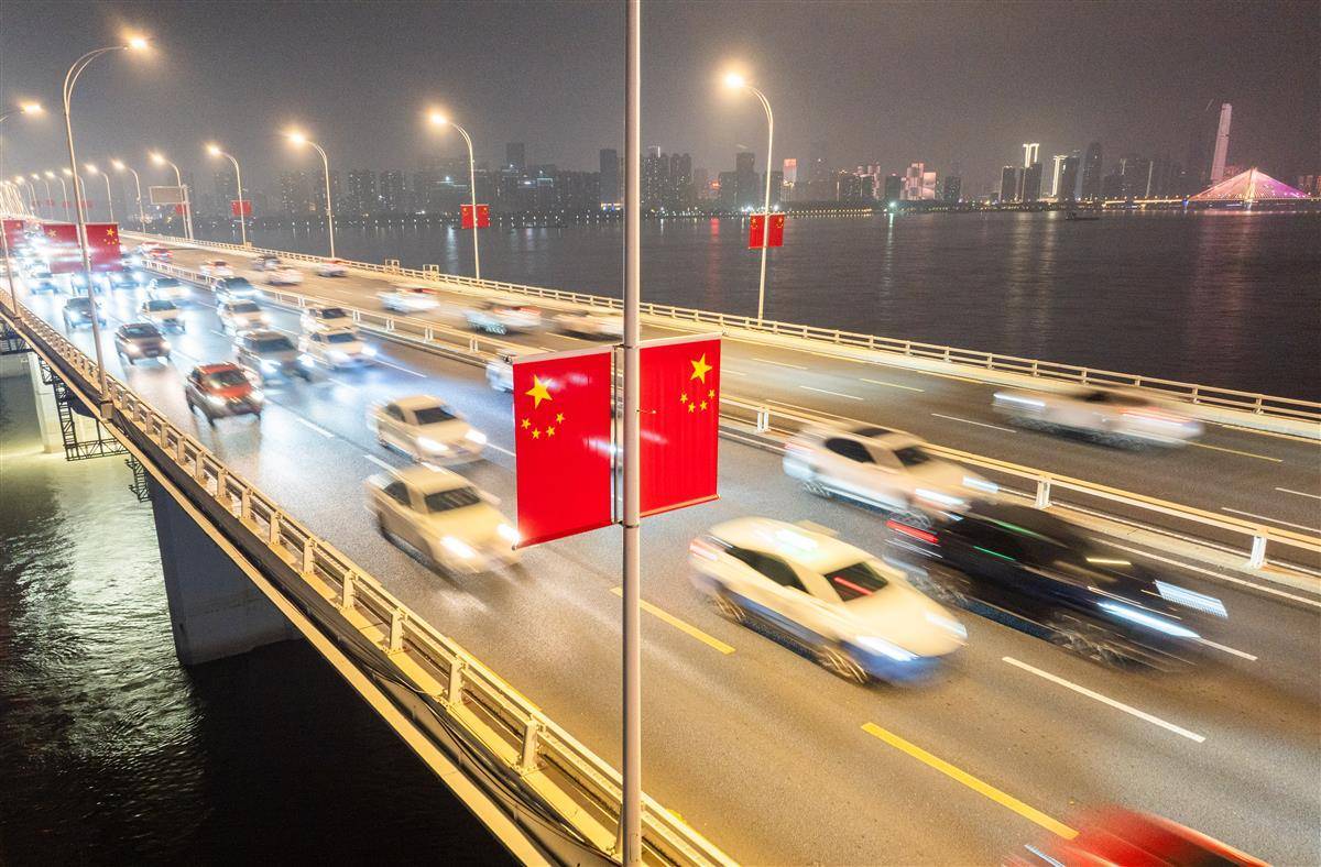 9月30日晚,节前晚高峰,武汉二七长江大桥上车水马龙。大桥两边悬挂的五星红旗迎风飘扬,让每一颗踏上归途的心,都在这份庄严而温暖的氛围中找到了节日的归属感。(湖北日报全媒记者 柯皓 摄)