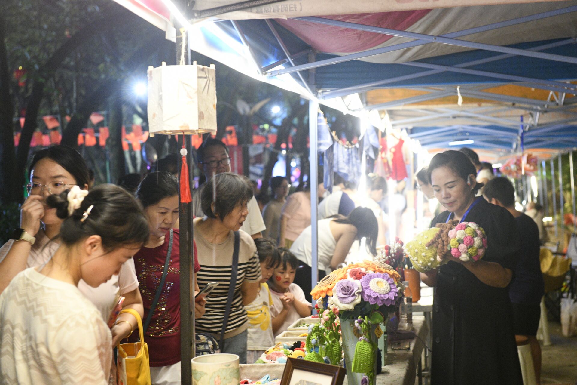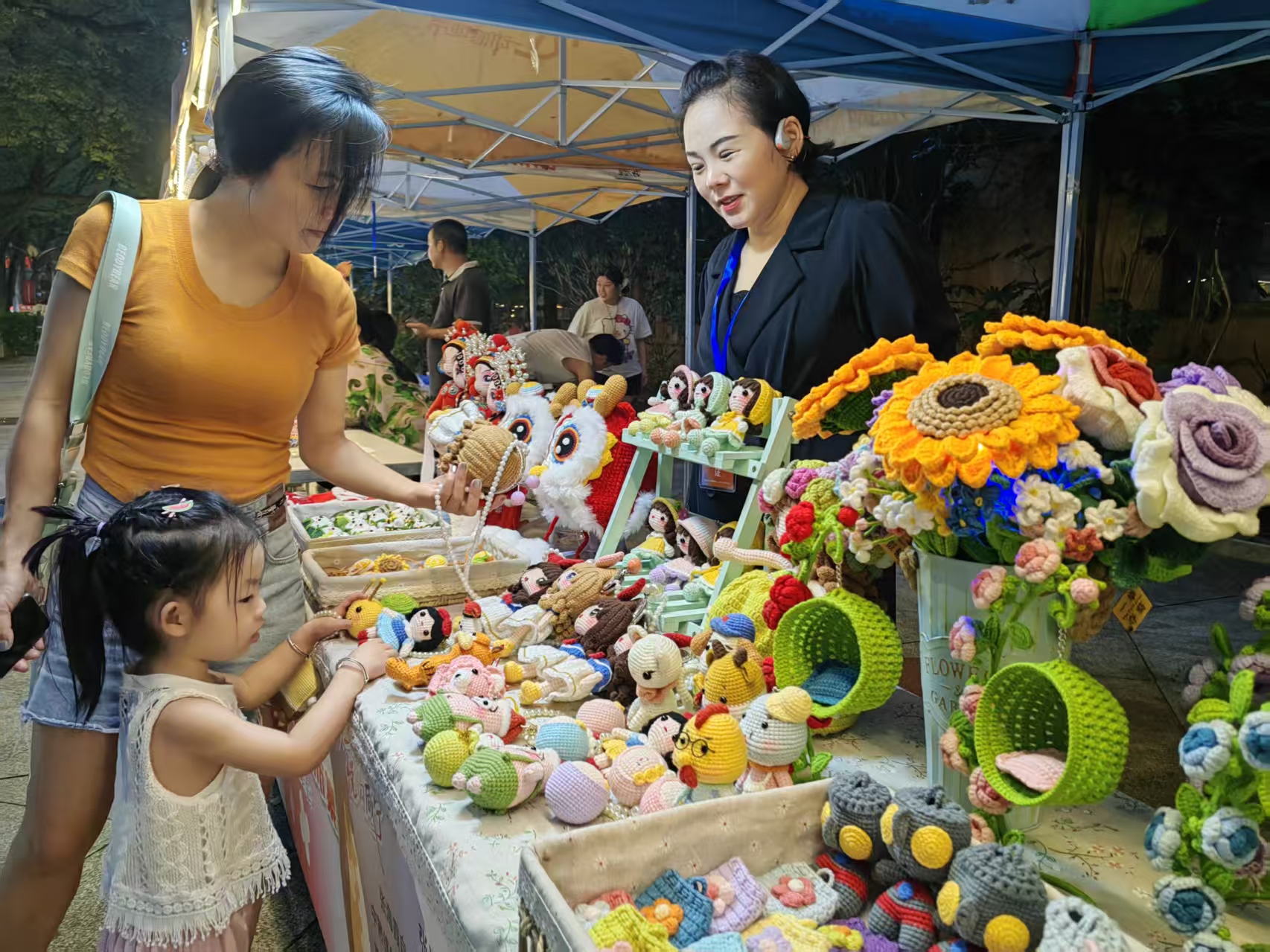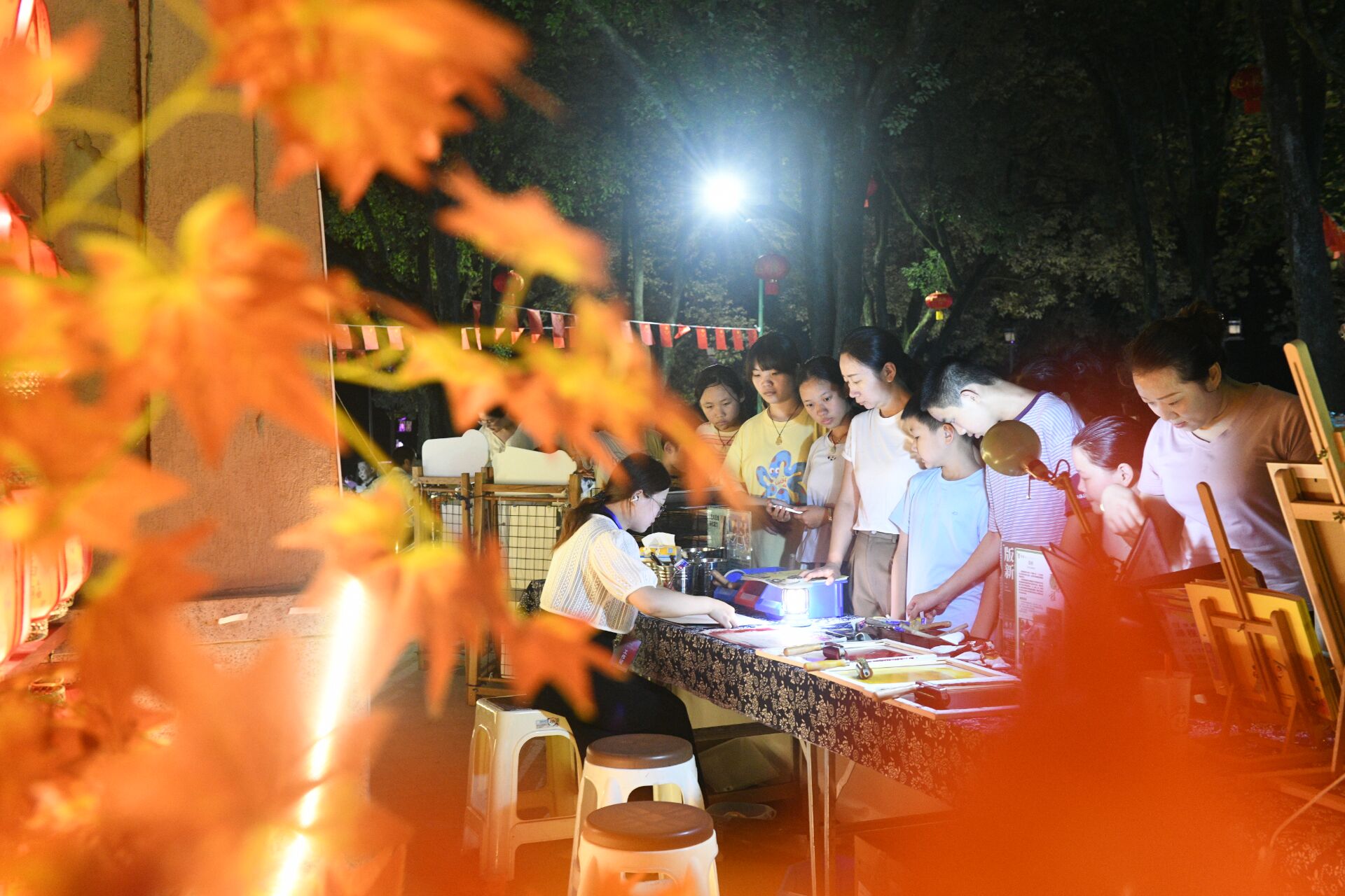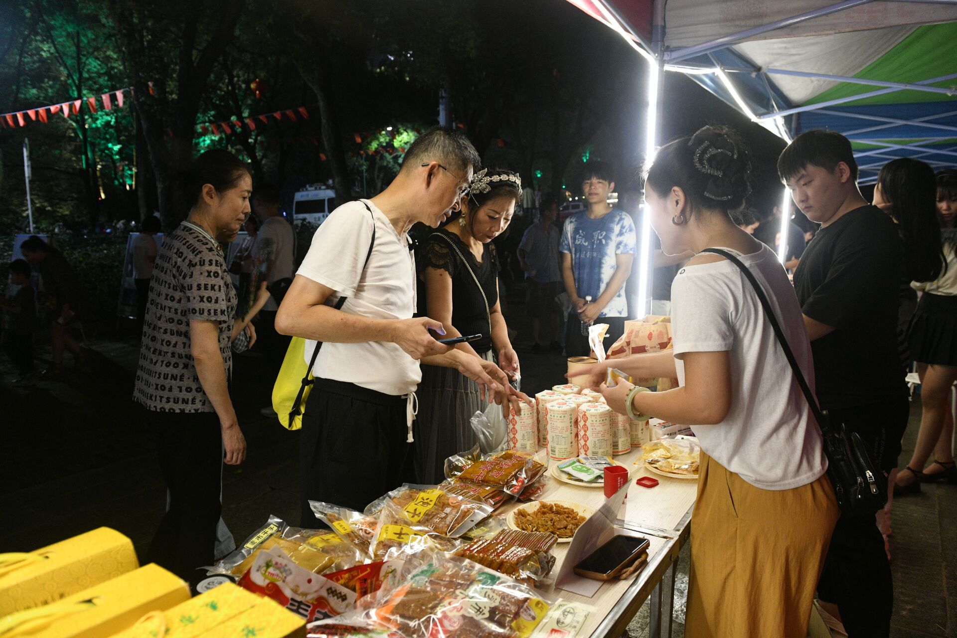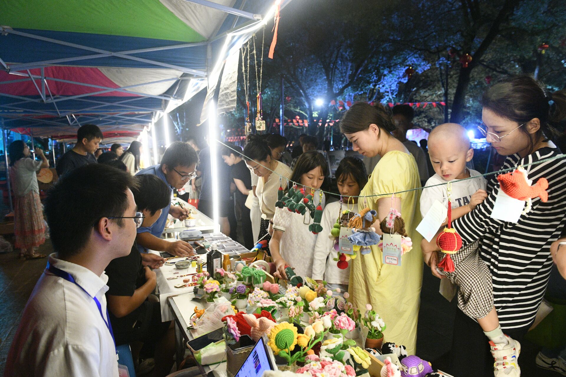 10月2日晚,月亮湾街区,由中共咸宁市委宣传部、咸宁市文化和旅游局主办的“创意香城幸福咸宁”咸宁优品.非遗文创市集人头攒动。游客穿梭在各个摊位欣赏、挑选心仪的物品。