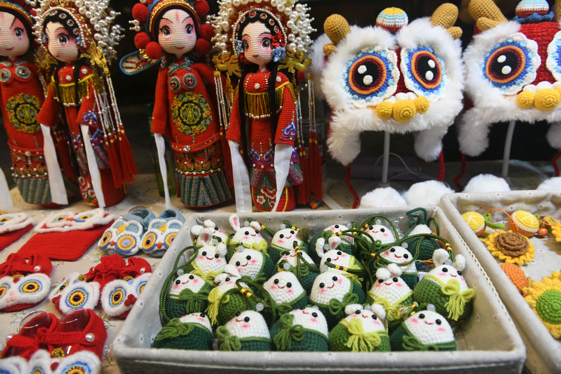 在张海霞绳艺编织摊位,一个个色彩鲜亮、栩栩如生的手工编制品瞬间吸引游客目光。张海霞介绍,这两天自己编织的很多手工品被游客购买走,虽有不舍,但很开心顾客们喜爱,希望更多的人了解和喜爱传统手工编织。