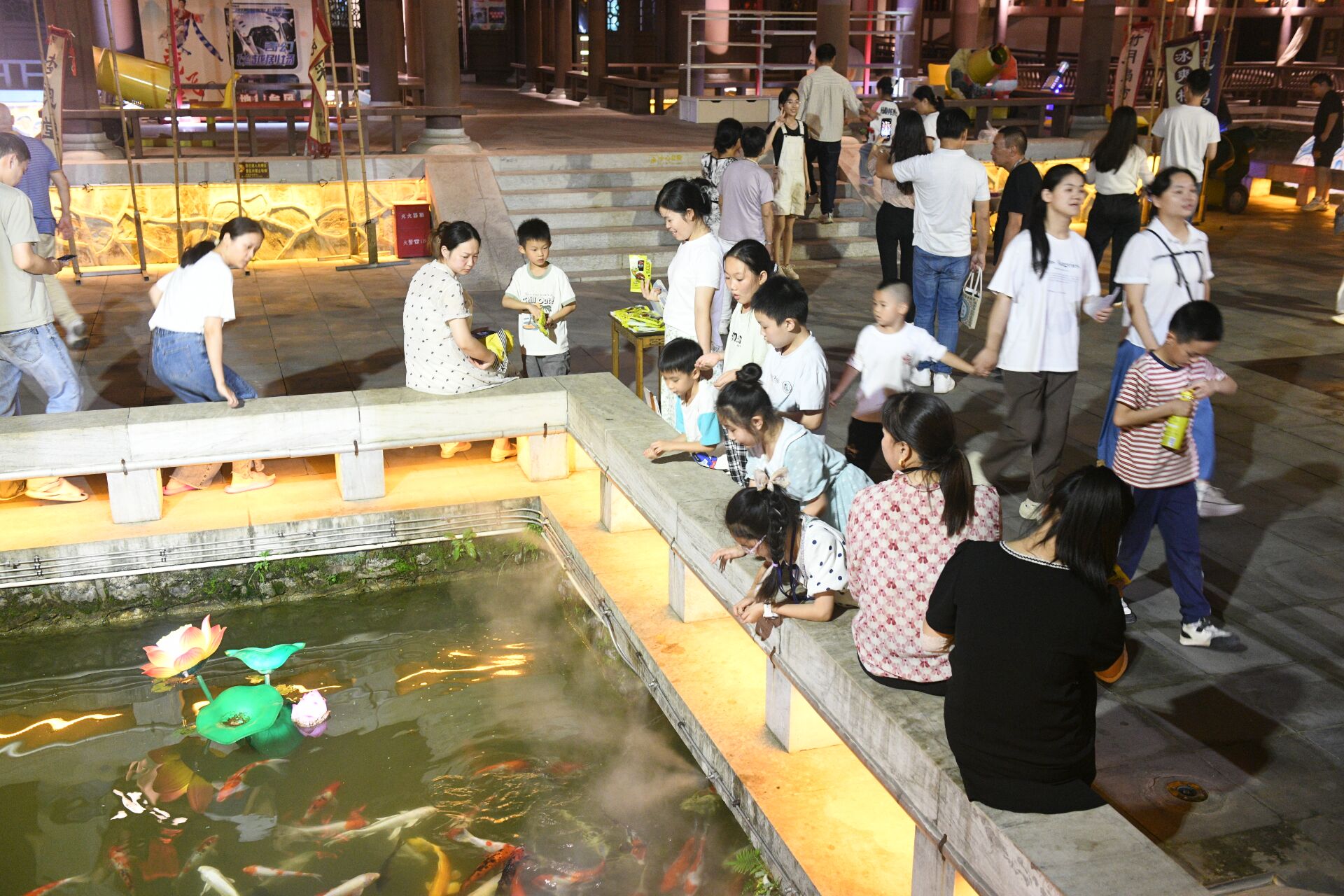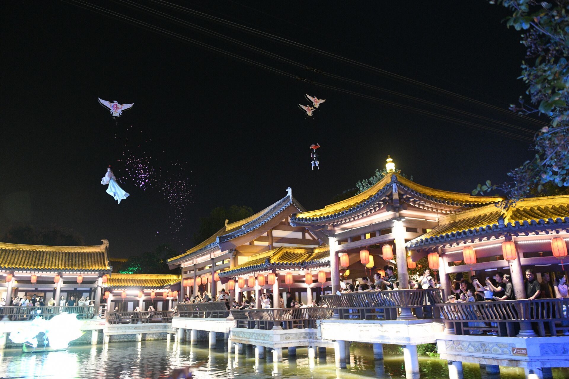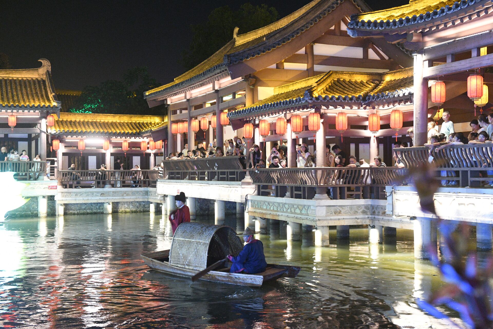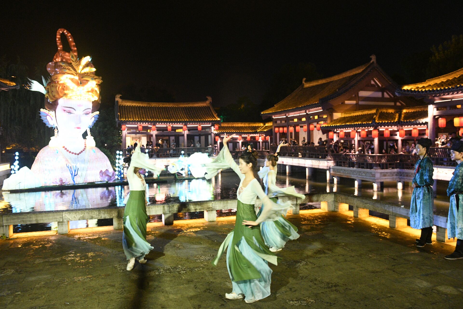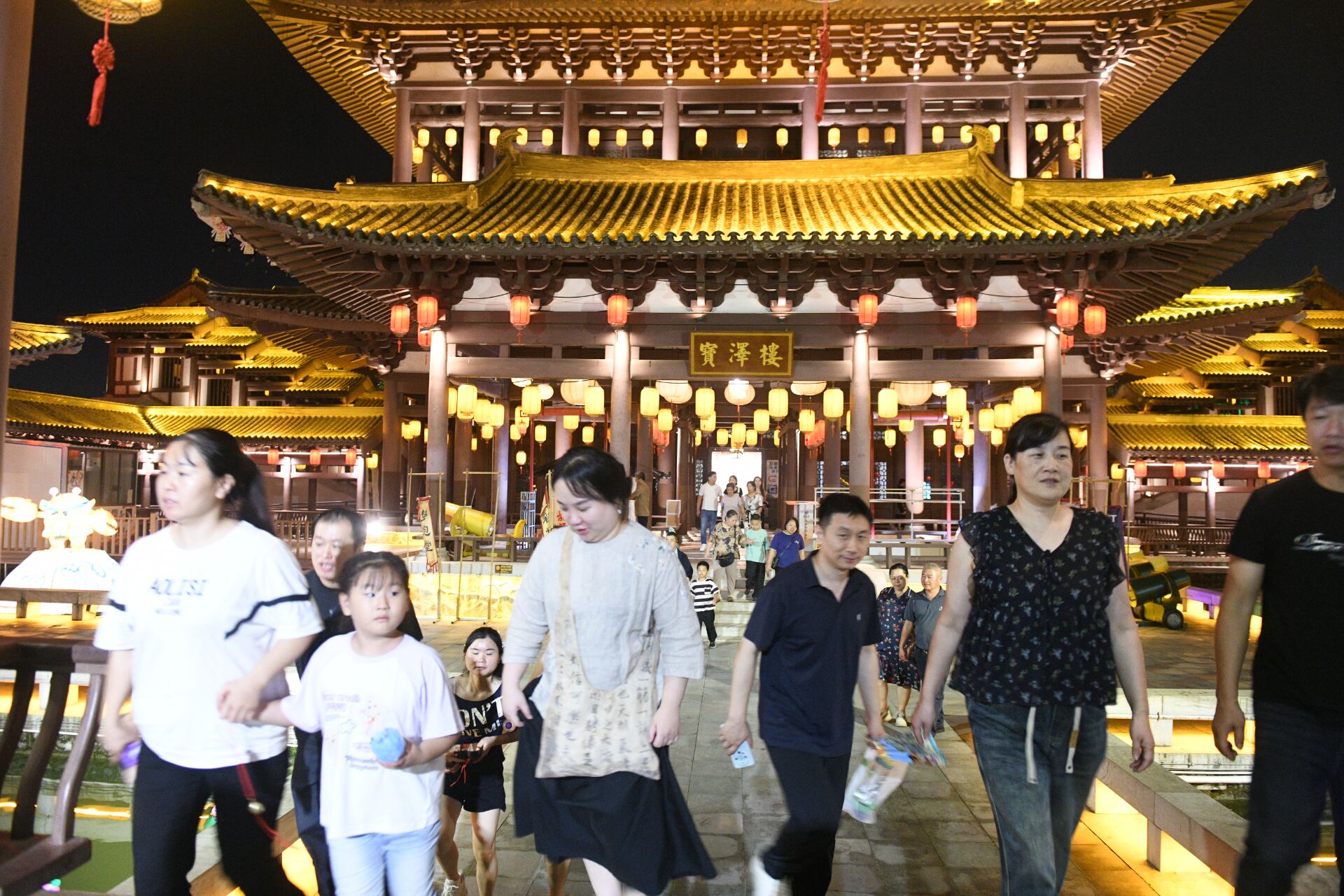 10月2日晚,龙潭里景区青砖黛瓦建筑群搭配仿古灯笼,营造出浓厚的古风夜市氛围。游客在此赏灯、游园、参与情景互动,观看演出,享受着浓厚的节日氛围。